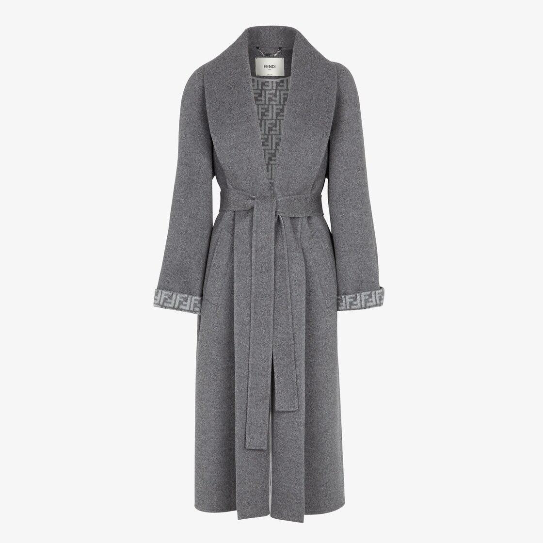 Midi-Mantel mit weitem Schalkragen und passendem Taillengürtel. Seitentaschen. Aus doppellagigem Wollstoff in Grau. Innenseite mit durchgehendem FF-Muster in Hellgrau.