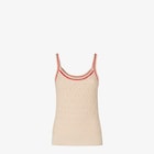 Ärmelloses Top mit weitem Ausschnitt und schmalen Trägern. Eng anliegende Passform und Saum im Rippenmuster. Aus Baumwollgarn in Beige mit durchgehendem, aufgesticktem Rautenmuster und FF-Durchbruchstickerei. Ausschnitt und Träger mit Streifenmuster in Rot.