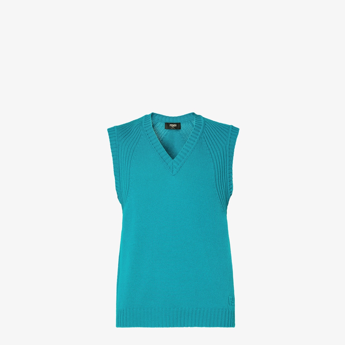 Regular-Fit-Weste mit V-Ausschnitt und Abschlüssen im Rippenmuster. Hergestellt aus Kaschmir in Türkis mit gestrickten Bahnen, die den Raglanschnitt und die Seitenpartien formen. Mit Micro-FF-Logo als Relief vorne links am Saum.
