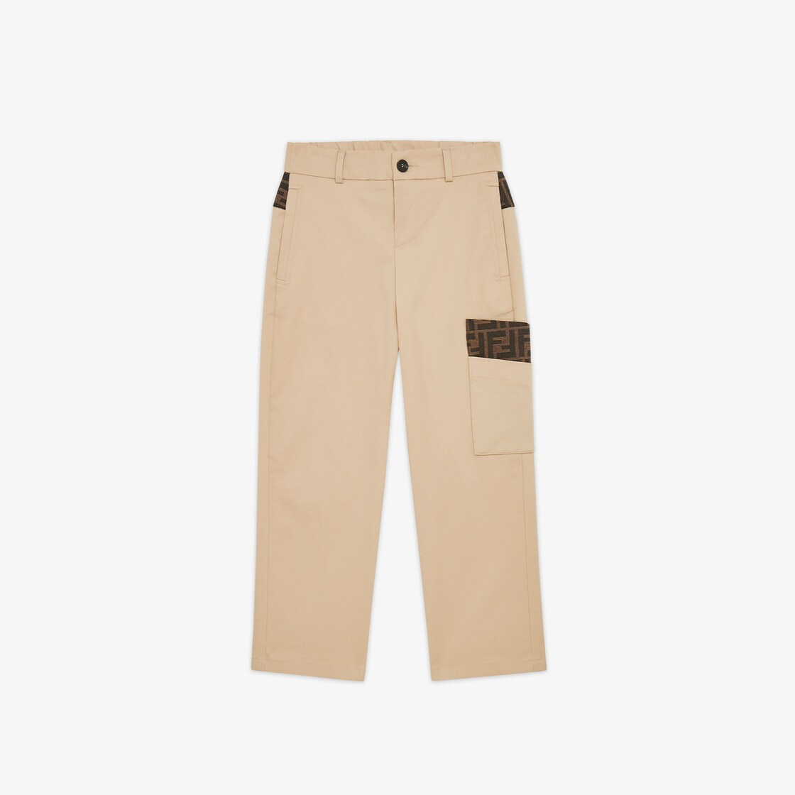Junior-Hose aus Stretch-Gabardine in Beige mit geradem Schnitt. Mit Seitentasche und Details aus Jacquard mit FF-Logo in Tabakbraun auf der Tasche und am Bund.