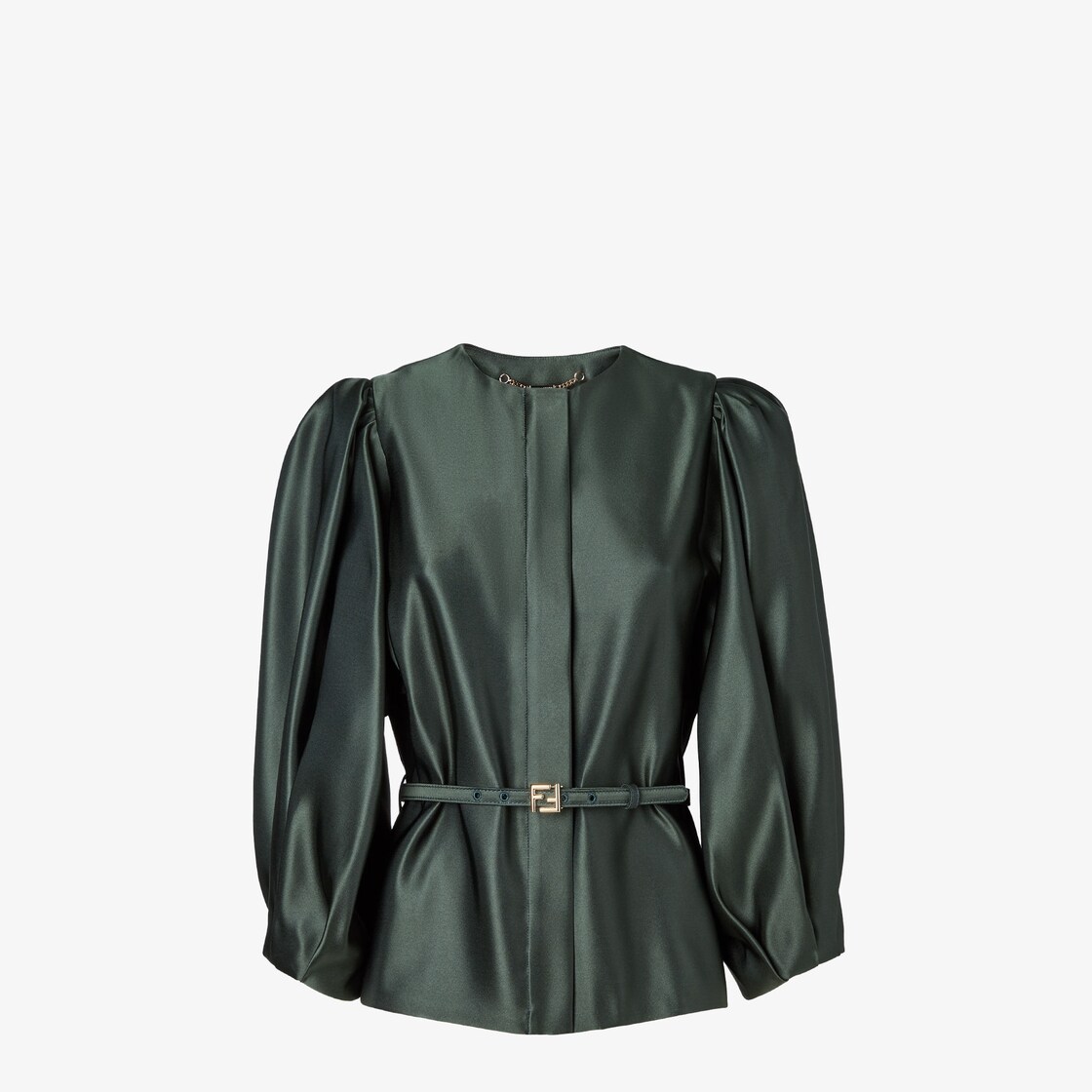 Crew-neck, straight-cut jacket with 3/4 balloon sleeves. Concealed front fastening. Made of dark green silk duchess satin. Matching belt with FF buckle.