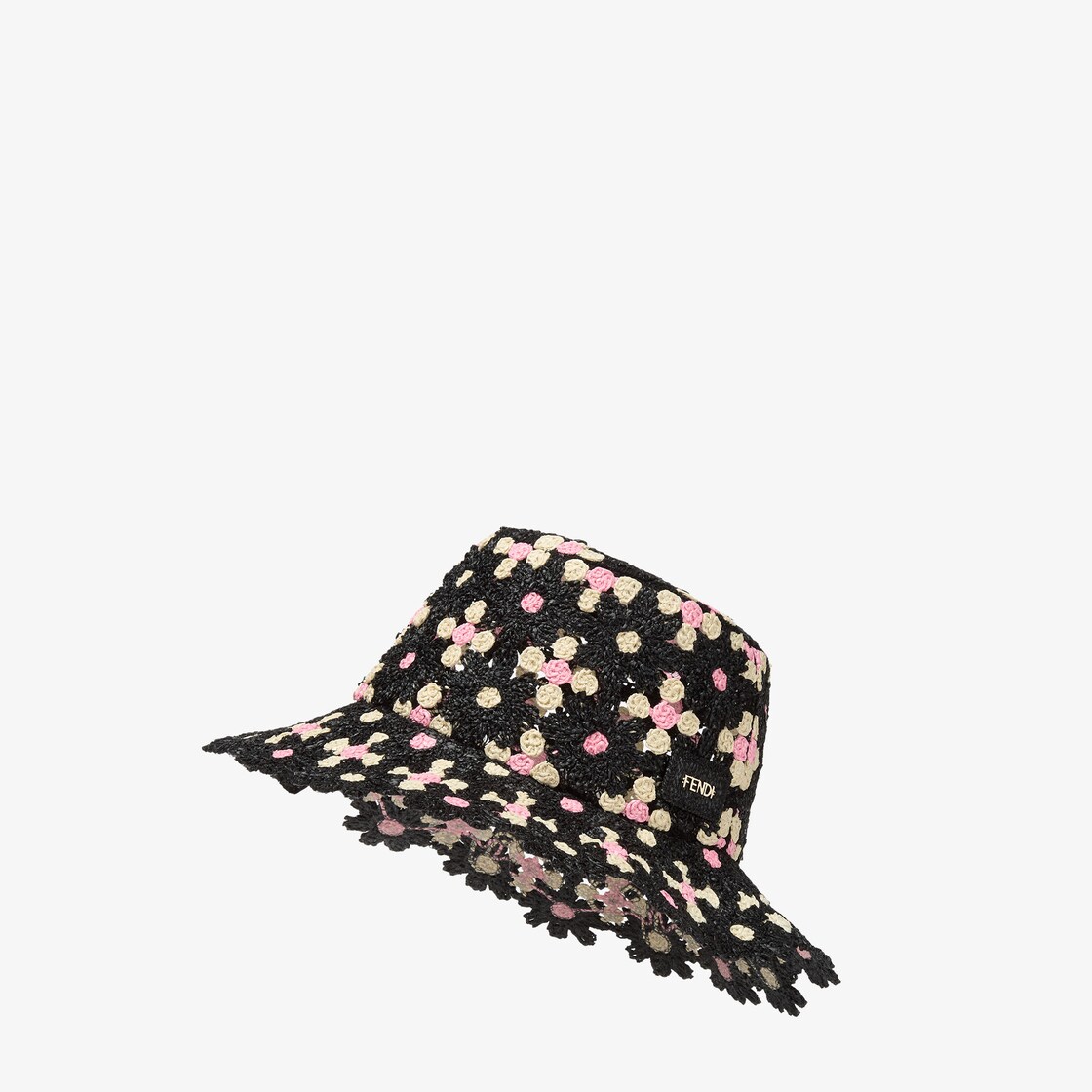 Bucket hat made of black raffia in a floral crochet with contrasting white and pink details. Customised with a gold-finish metal Fendi lettering label. Unlined.