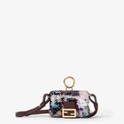 Iconic Nano Baguette bag, with flap and FF clasp with press stud button. The snap hook allows it to be attached like a charm to larger bags or belts. Can also be worn cross-body thanks to the slender adjustable, detachable chain shoulder strap. Flat credit card holder pocket inside. Embroidered all-over with multicolour sequins for a faded effect. Details and shoulder strap in burgundy calfskin. Gold-finish metalware.