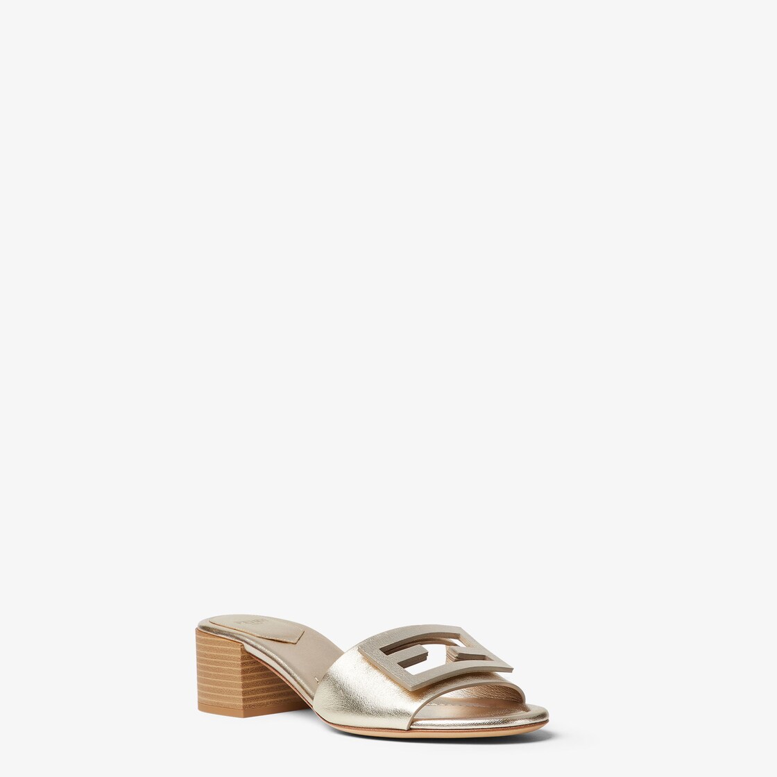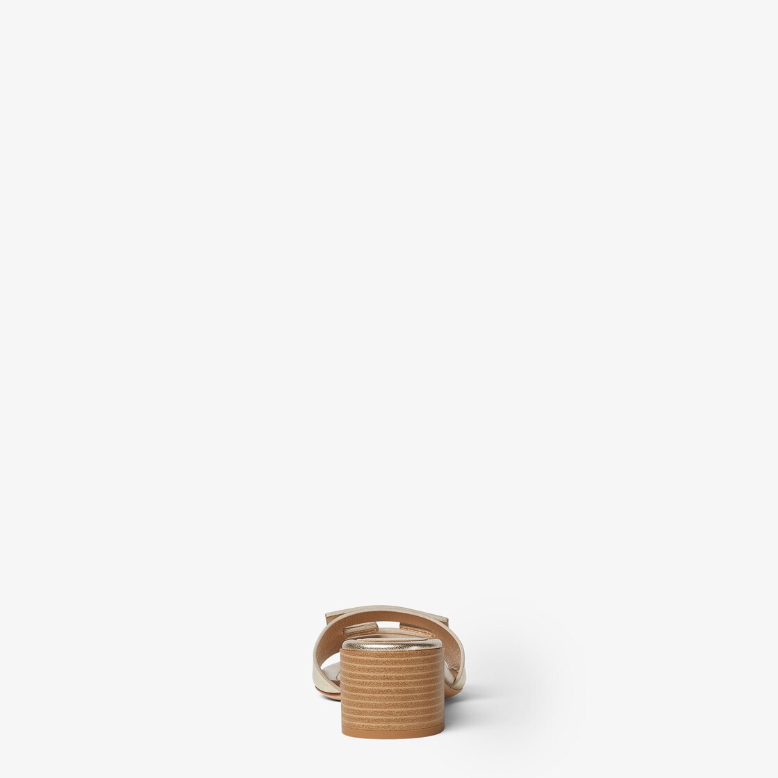 Sandalia tipo chancla con banda ancha. Confección en piel laminada color platino y acabada con macropespuntes tono sobre tono hechos a mano, un emblema de la exquisita elaboración Selleria, transmitida por los artesanos de Fendi desde 1925. Motivo FF Baguette® tono sobre tono. Tacón ancho revestido en cuero.