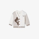 Cárdigan para bebé confeccionado en lana y algodón en tonos crema y beis, adornado con osito en intarsia con logo FF color tabaco en uno de sus lados.