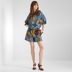 Cortavientos reversible con capucha y bajo con cordón ajustable. Modelo corto con manga con sisa caída y puños elásticos. Bolsillos con ribeteado vertical en ambos lados. Cierre con cremallera de doble tirador. Confección en nailon FF color azul claro, con estampado all over Falena en tonos negro y amarillo. Interior color azul claro liso, con parche Fendi Roma de piel tono sobre tono aplicado en el pecho. Accesorios de metal con acabado paladio.