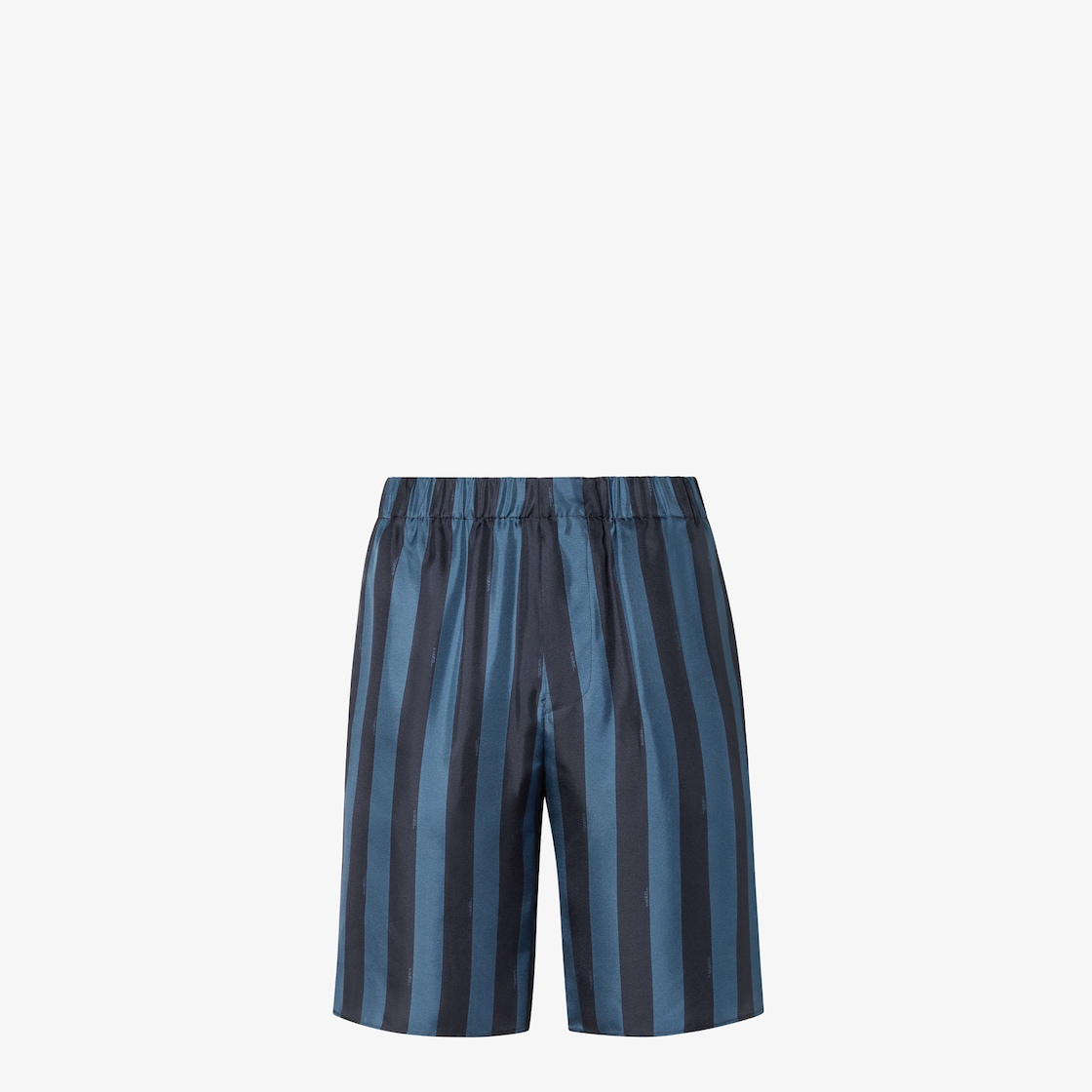 Pantalón bermuda con bolsillos laterales y cintura elástica. Confección en seda con las icónicas rayas Pequin interpretadas en tonos azul claro y azul. Acabado con pequeños cortes laterales redondeados.