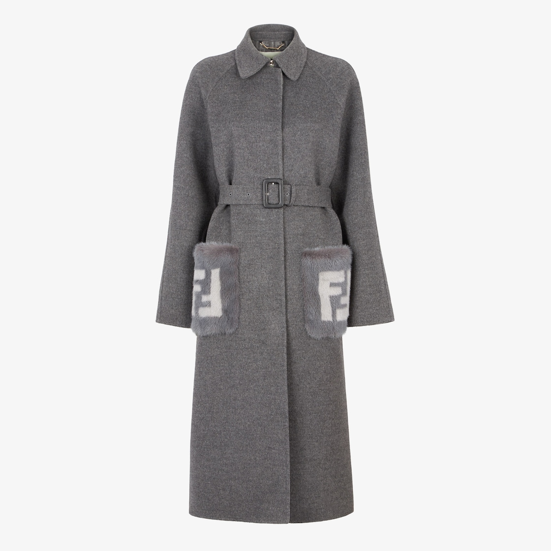 Abrigo de largo medio y corte recto con aberturas laterales en el bajo. Presenta solapas de punta, bolsillo pequeño en el pecho y bolsillos aplicados. Cierre de abotonadura doble con botones. Confección en lana doble gris e interior con motivo FF a tono. Los bolsillos de visón gris oscuro están personalizados con motivo FF en intarsia gris.