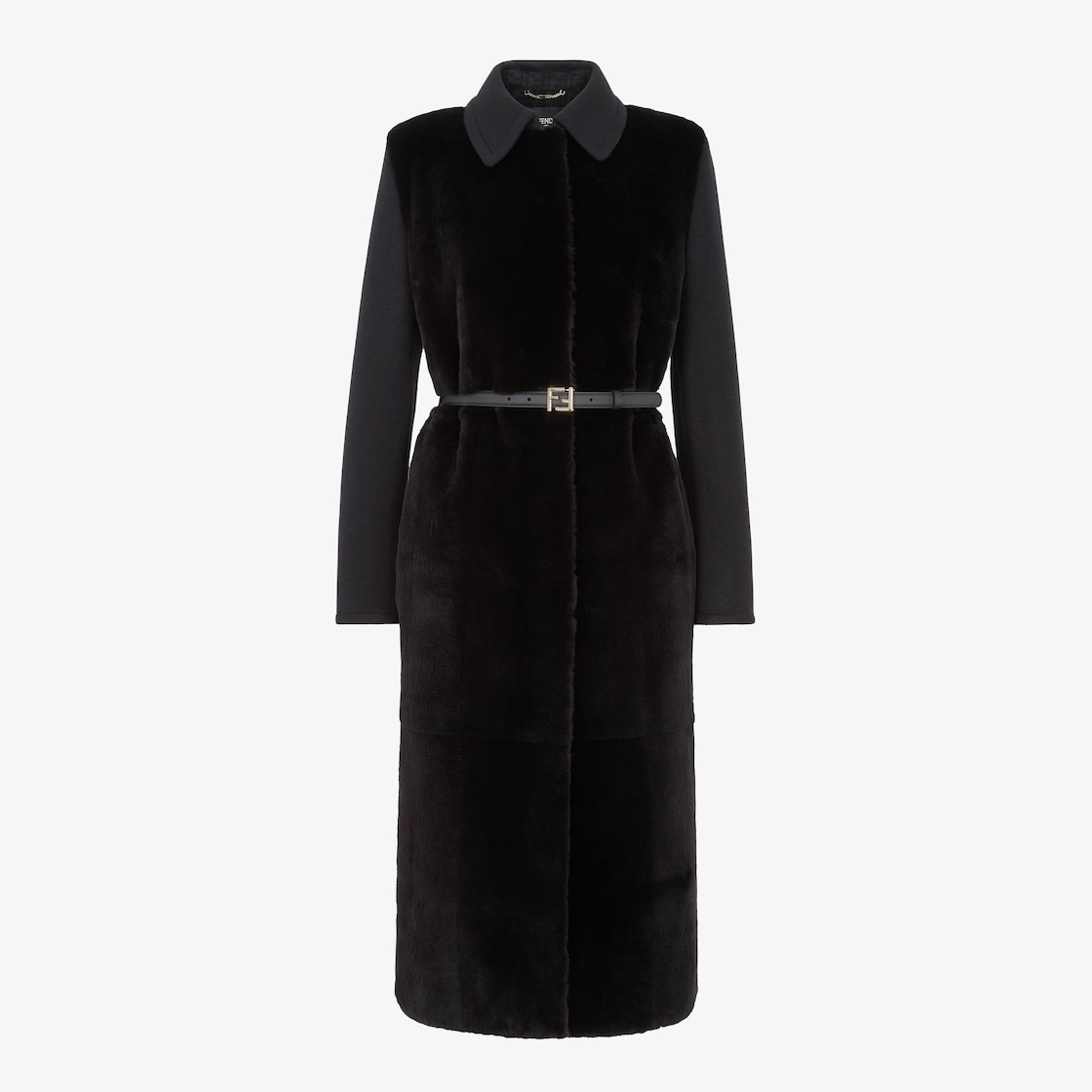 Abrigo largo de abotonadura sencilla y corte recto con abertura central en la espalda. Presenta cuello de camisa y manga con sisa regular. Cierre oculto. Confección en lana doble en tonos negros con interior con motivo FF en los mismos tonos. Aplicación de visón rasurado negro en la parte delantera.