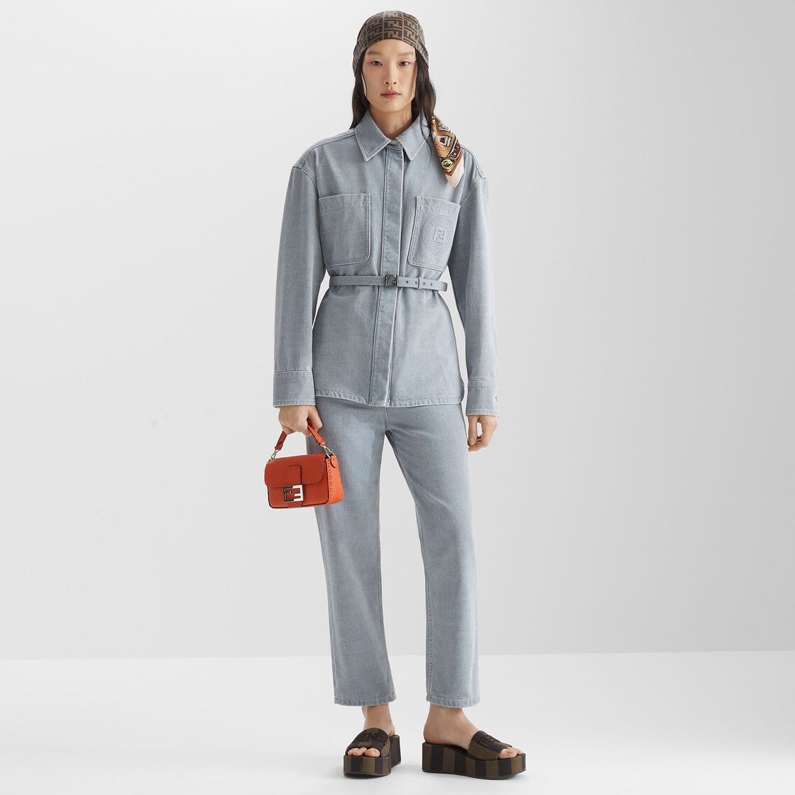 Icónico bolso Baguette tamaño mini, confeccionado con 309 macropespuntes tono sobre tono hechos a mano, un emblema de la exquisita elaboración Selleria transmitida por los artesanos de Fendi desde 1925.