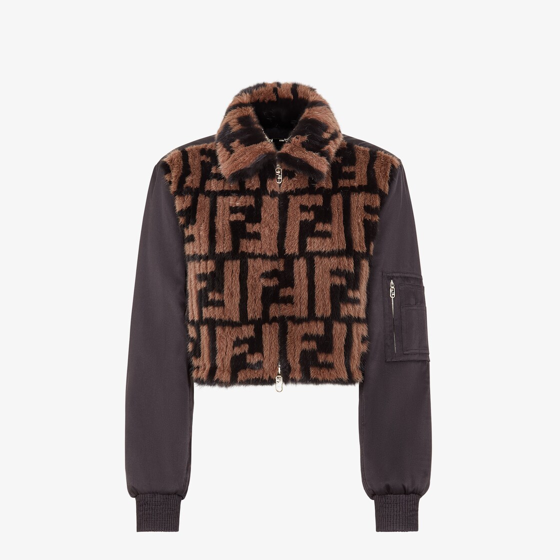 Chaqueta bomber corta con cierre de cremallera de doble cursor. Presenta cuello de camisa y mangas de punto acanalado. Bajo con cordón ajustable y bolsillo pequeño con cremallera en la manga derecha. Confección en visón negro con motivo integral FF estampado en tonos marrones. Espalda y mangas de satén negro. La elaboración especial Featherlike, sobre una base de chifón, la convierte en una prenda muy ligera. Cierre oculto con ribete de satén.