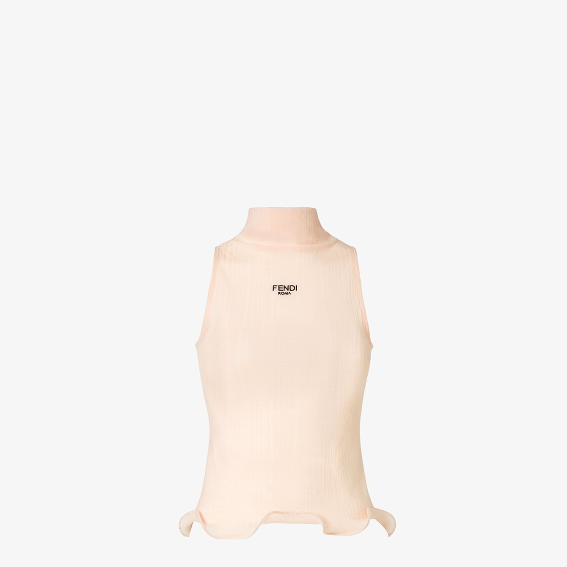Top sin mangas de corte ceñido con cuello alto. Confección en punto de algodón rosa claro con elaboración acanalada. Acabado con volantes en el bajo e inscripción Fendi Roma bordada en el pecho en tonos negros.