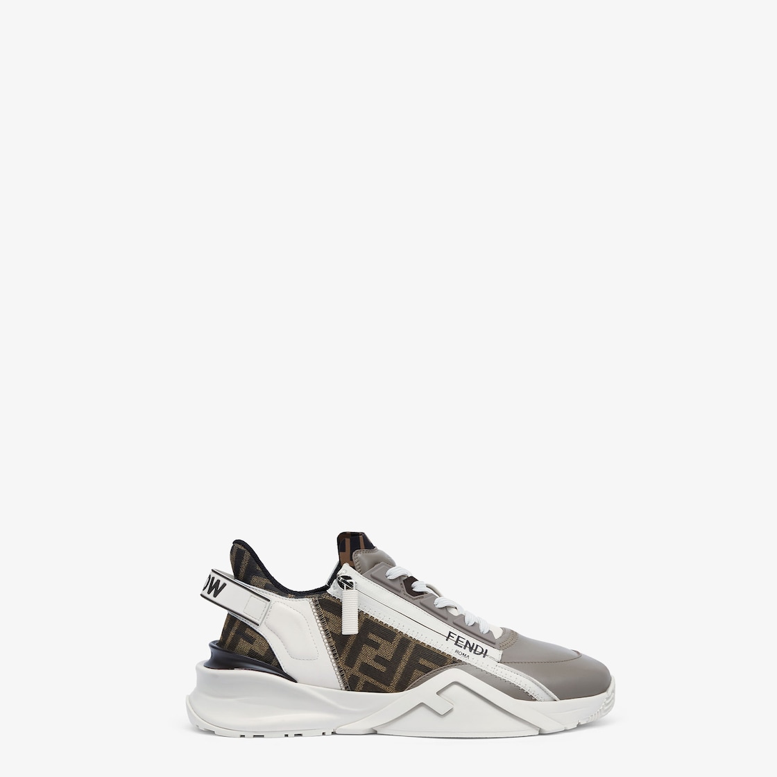 Zapatilla deportiva Fendi Flow con cordones elásticos ajustables y cierre con cremallera lateral. Personalizada con el patrón FF en la lengüeta y etiqueta de goma con logotipo en relieve en la parte trasera del talón. Confección en piel beige. Detalles de tejido FF. Suela estilo corredor de goma blanca de 35 mm con detalle F diagonal.