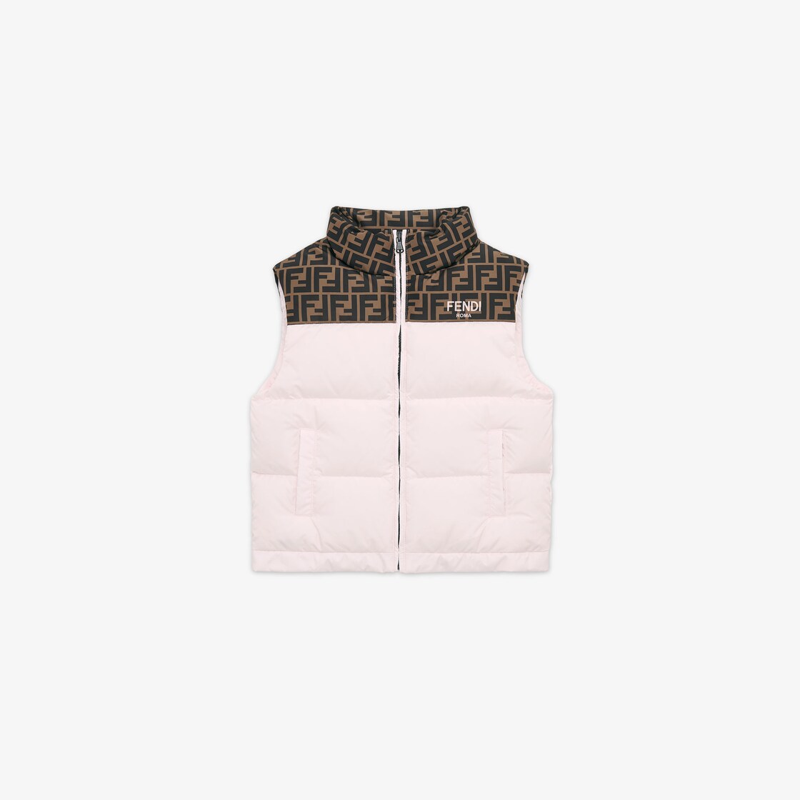 Chaleco júnior de nylon rosa acolchado con detalle del logo FF integral color tabaco en los hombros y en la parte delantera.