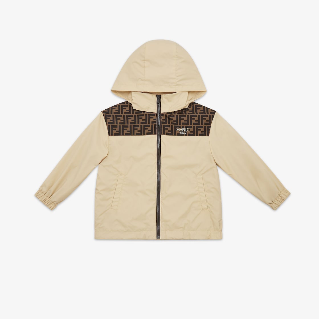 Cortavientos júnior de nylon beige con capucha y cremallera. Detalle del logo FF integral color tabaco en la parte delantera.