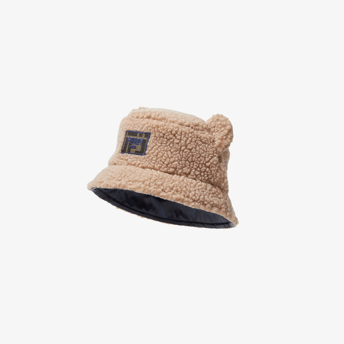 Cloché júnior de efecto peluche beis, con detalle de orejas, parche de nailon azul con logo FF tono sobre tono y forro de nailon.
