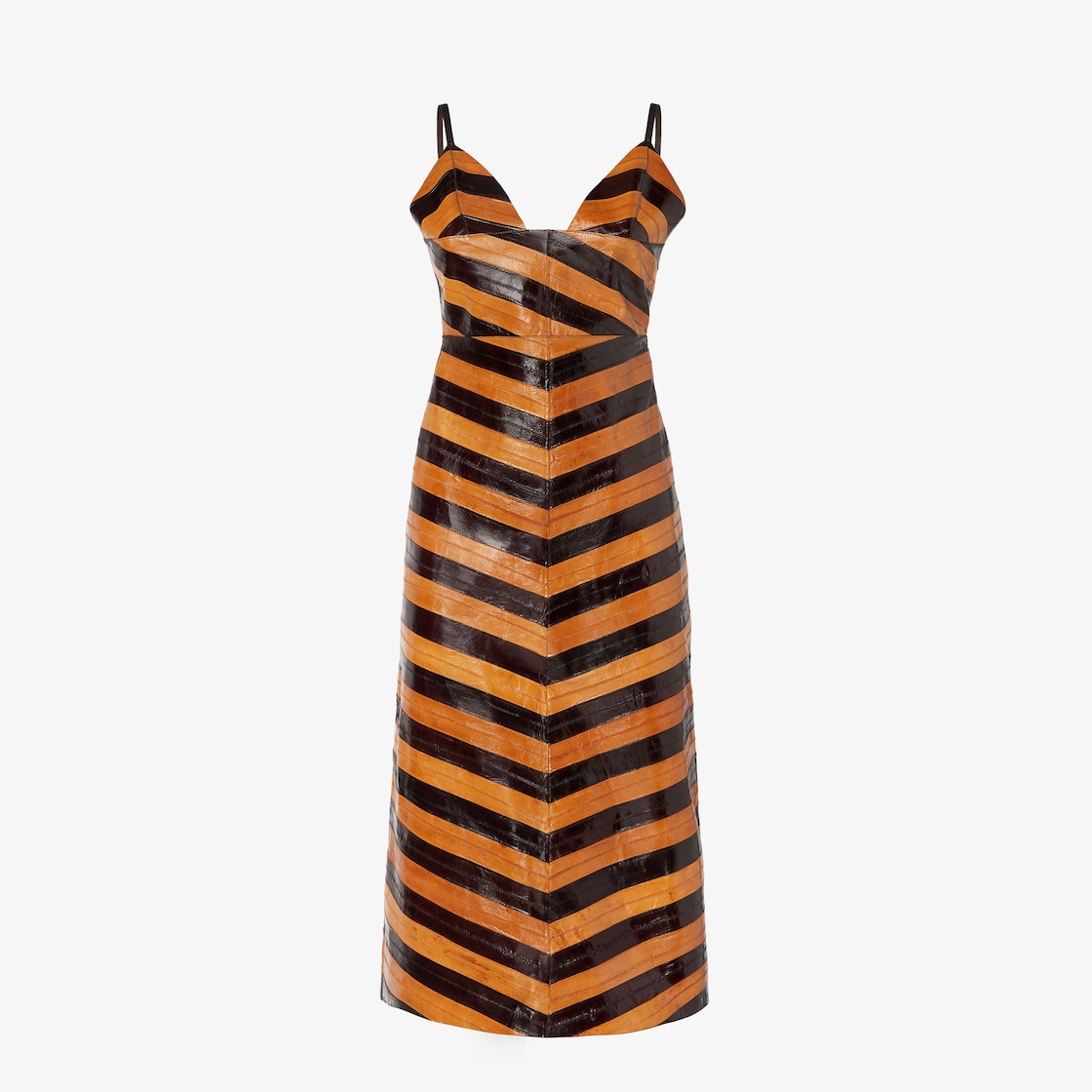 Sleeveless midi dress with wide neckline and thin shoulder straps. Waistline seam and flared skirt. Unlined. Made of hagfish leather with an inlaid Chevron motif in dark brown and caramel, inspired by an archive Fendi design.