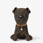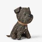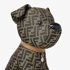 Totem Ito en jacquard FF marron. Le totem en forme de chien s’inspire d’Ito, le chien de la directrice artistique Silvia Venturini Fendi. Collier en cuir marron avec petite médaille à logo. Garnitures en métal finition palladium. Conçu comme décoration ou idée cadeau.