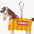 Bijou de sac poulain Fendi en daim beige. Avec crinière et queue en cuir nappa noir travaillée en fines lanières. Couvre-selle en cuir nappa multicolore dans les tons jaune et orange avec motif de rayures verticales en relief et broderie Fendi.