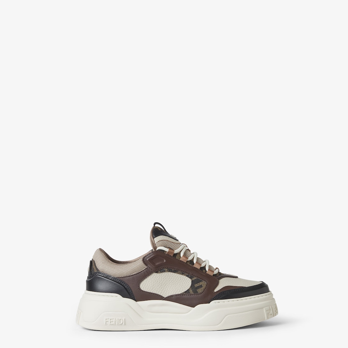 Chaussures basses à lacets Fendi Force. En cuir grainé blanc, avec empiècements rembourrés. Détails en jacquard FF marron, cuir lisse marron et tissu technique beige. Semelle épaisse et légère en caoutchouc blanc avec motif FF sur le bout et le talon.