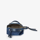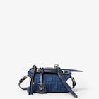 Les poignées et la bandoulière réglable et amovible, à nouer, toutes deux en cuir bleu foncé, permettent de porter le sac à la main, à l’épaule ou croisé.
