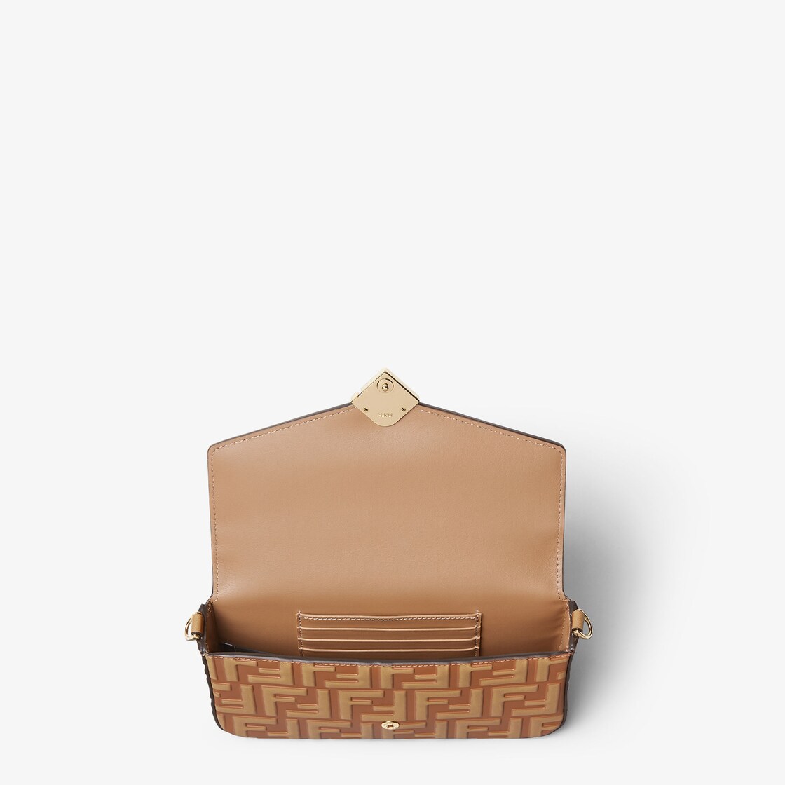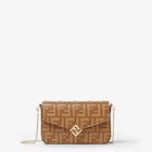 Portefeuille FF Diamonds de forme compacte, avec rabat à ligne géométrique et logo FF en diagonale. Intérieur doté de quatre fentes porte-cartes. Bandoulière en chaîne fine amovible. En cuir de veau avec motif FF en relief dans les tons cuir naturel et marron clair. Garnitures en métal finition dorée.