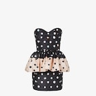 Robe bustier courte avec décolleté en cœur et découpe péplum à la taille. Fermeture zippée dans le dos. Inspiré par une robe réellement portée par Silvia Venturini Fendi dans les années 80, elle est réalisée en taffetas noir et rose avec motif Falena Dots de couleur contrastée imprimé all-over.