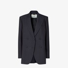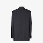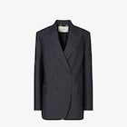 Blazer à double boutonnage et coupe légèrement allongée. Col à revers en pointe, manches longues et poche poitrine. Poches à rabat plaquées sur le devant. Fermeture avec boutons recouverts dans le ton. Réalisé en laine avec motif Fendi à fines rayures dans les tons noirs. Peut être porté avec une fermeture classique à double boutonnage ou attaché uniquement avec le bouton central, pour une allure plus décontractée.
