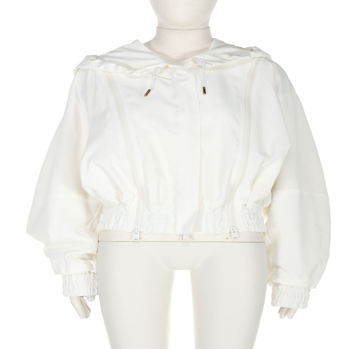 Bomber court à col montant et capuche amovible avec cordon de serrage. Manches larges et basses et bord élastique. Fermeture zippée dissimulée à double curseur. En tissu de viscose technique blanc. Fermeture zippée verticale sur le devant.