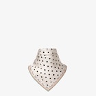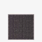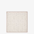 Foulard carré réalisé en soie ivoire. Le motif Falena Dots réinterprète le motif intemporel à pois avec un trait irrégulier résolument décontracté. Les pois noirs, dessinés à la main, alternent avec des détails logotypés et un bord décoré avec l’inscription « Fendi Roma 1925 », hommage au centenaire de la Maison. Finition avec cadre color block à rayures. Bords roulottés à la main.