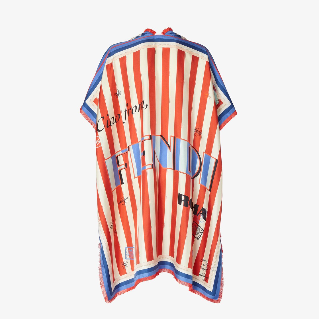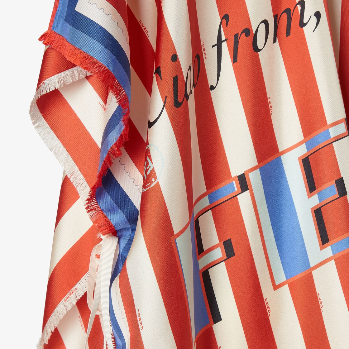 Poncho wrappy, avec rubans à nouer sur les côtés. En soie. Personnalisé avec le motif Fendi Pequin Postcard : une réinterprétation de l’héritage italien avec un grand logo Fendi à rayures bleu clair et bleu au centre, sur un fond rayé Pequin dans les tons rouille et blanc ivoire. Bords effrangés.
