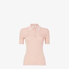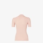 Pull ajusté à manches courtes. Col polo intemporel fermé par trois boutons en nacre. En fil rose clair. Inscription Fendi incrustée sur le côté gauche. Col amovible en vison dans les mêmes tons.