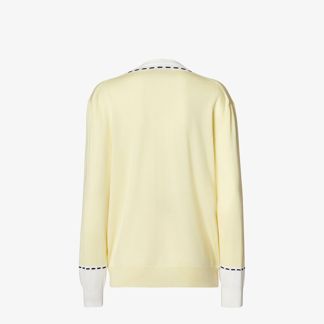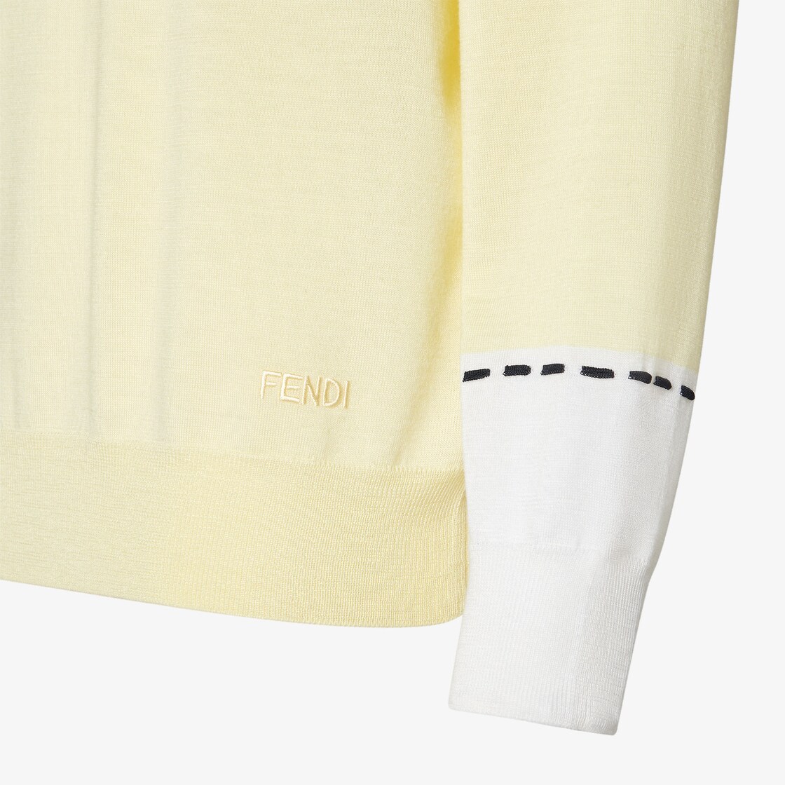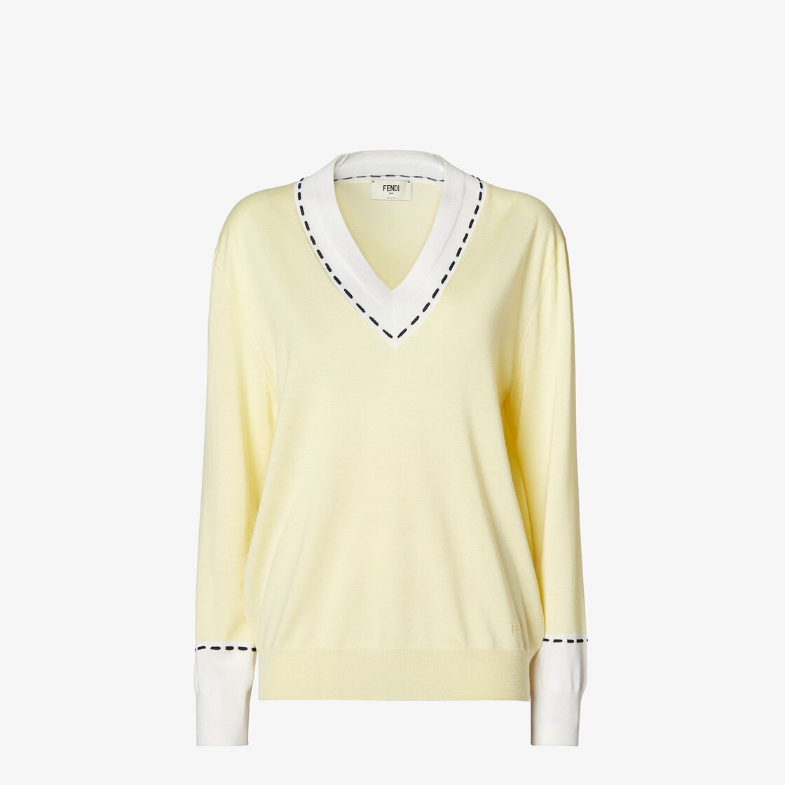 Pull oversize avec col en V et manches à emmanchures basses. Bords finement côtelés. En fil de laine et de soie jaune. Liseré contrasté et motif surpiqué Selleria 3D dans les tons noir et blanc. Logo Fendi brodé ton sur ton sur le côté gauche.