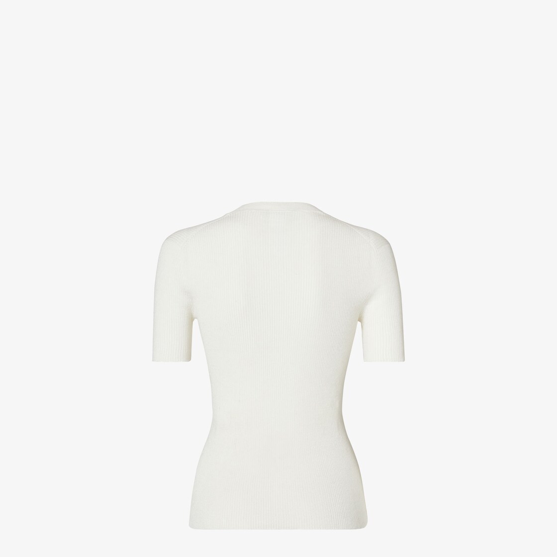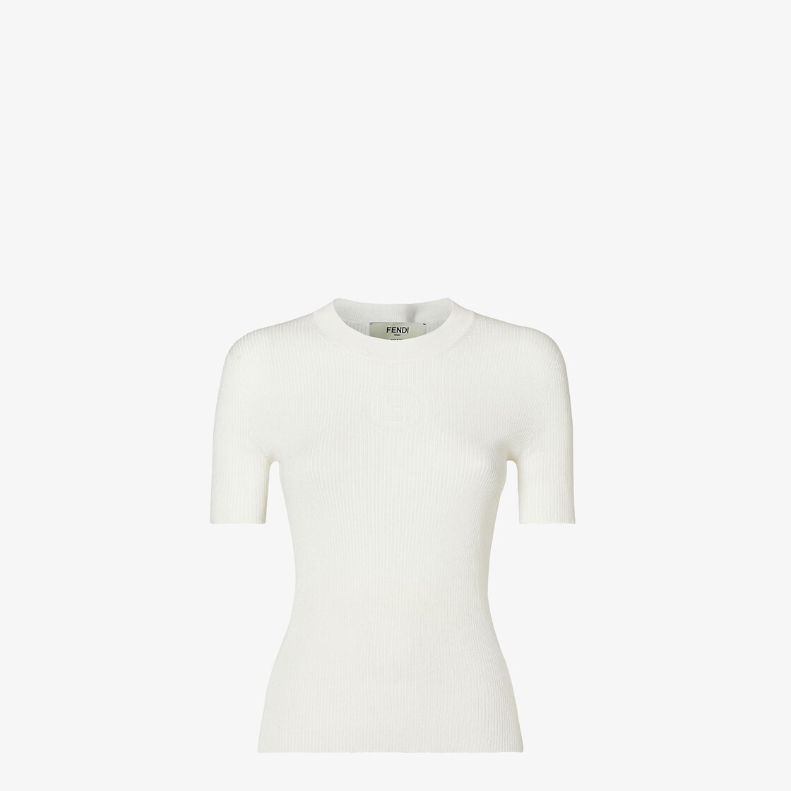 Pull ajusté avec col rond et manches courtes. En fil de coton blanc, finement côtelé et sans couture. Motif Fendi Stamp 1925 microajouré effet dentelle sur le devant.