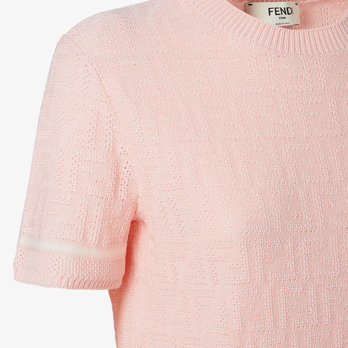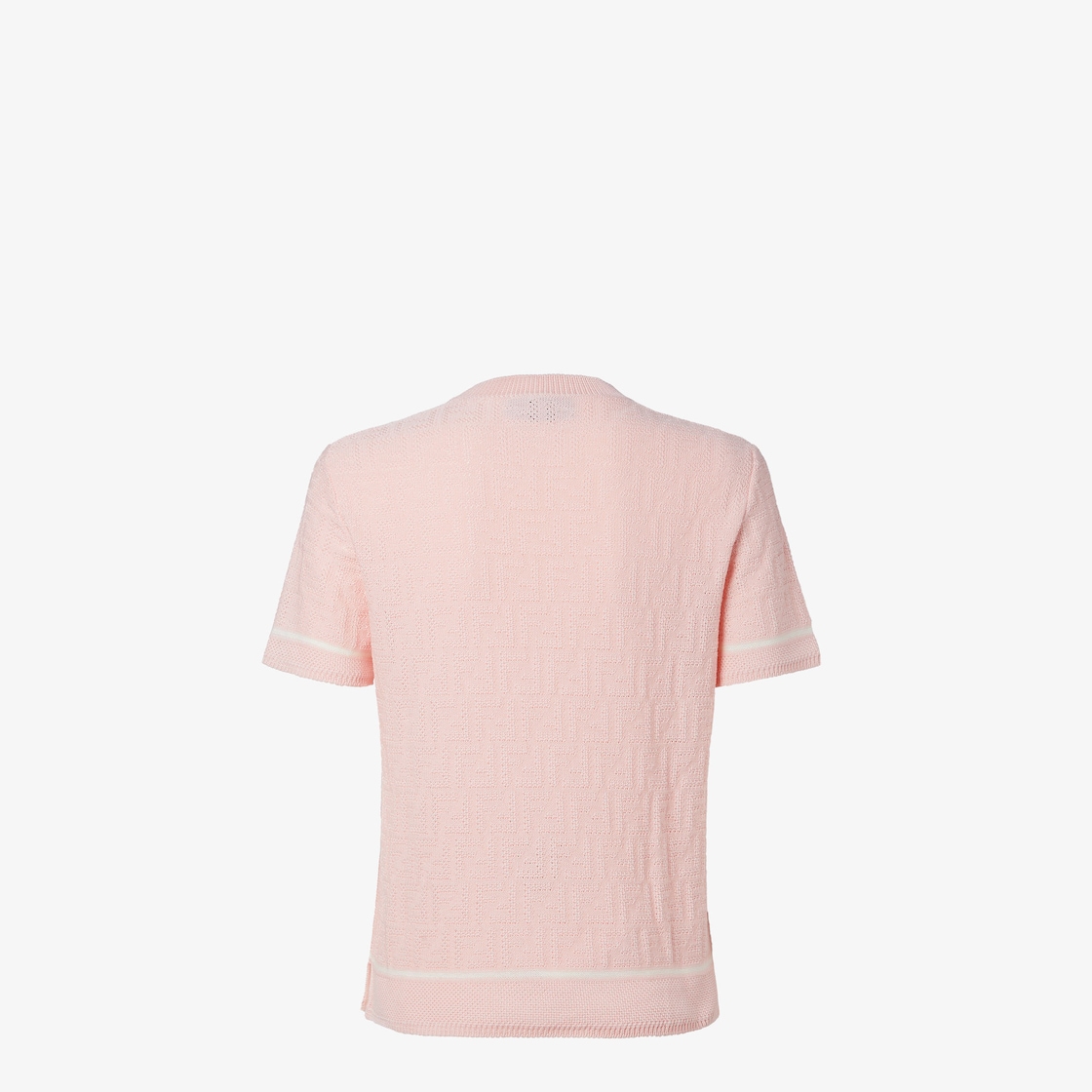 Pull à col rond finement côtelé et manches courtes. En fil de coton travaillé au crochet selon le motif FF dans les tons rose clair. Rayures blanches contrastées sur les manches et le bas.