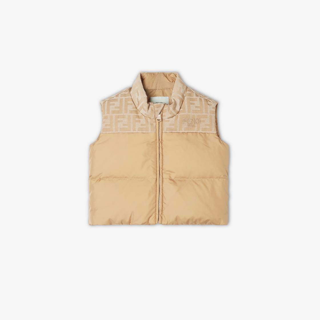 Haut sans manches bébé en nylon beige avec détails en tissu jacquard à logo FF ton sur ton sur les épaules. Broderie Fendi sur le devant et intérieur en plume.