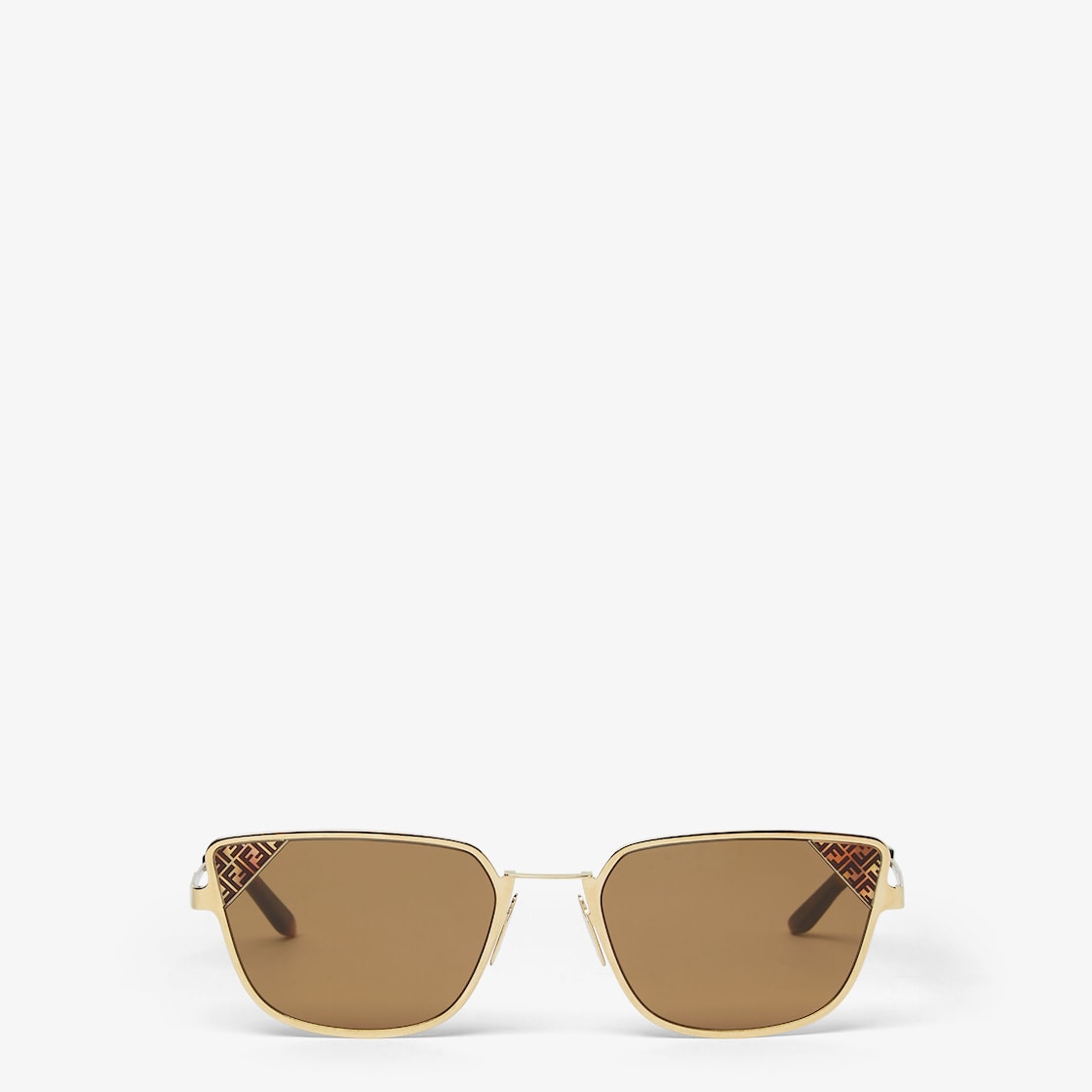 Lunettes de soleil Fendi Signature de forme œil-de-chat en métal doré. Verres couleur tabac et monture en acétate havane avec motif FF, assorti aux embouts. Plaquettes réglables.