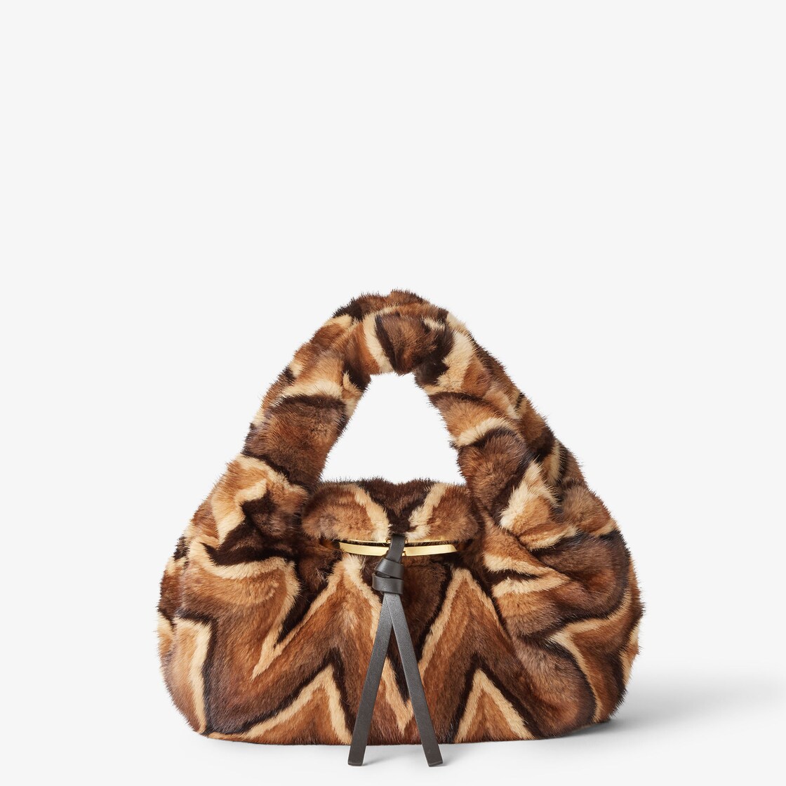 En doux vison incrusté à la main pour créer un motif chevron dans les tons beige, marron et noir avec des nuances naturelles.