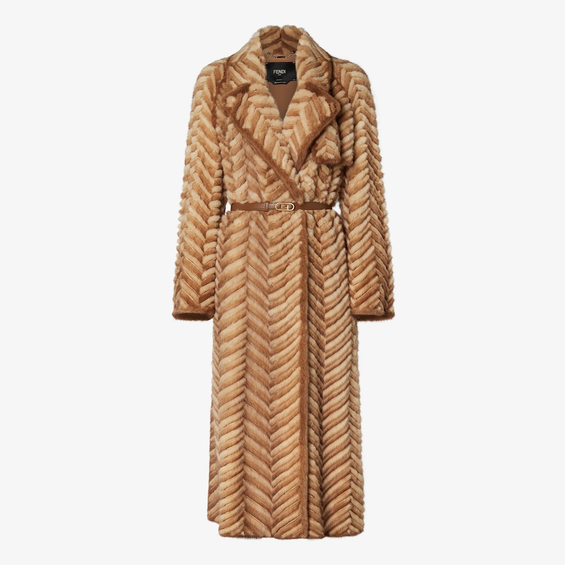 Manteau long modèle trench-coat. Ceinture assortie en cuir avec boucle Fendi O’Lock en métal. En vison avec motif chevron dans les tons marron clair. Ce vêtement est extrêmement léger à porter grâce à sa confection particulière Featherlike.