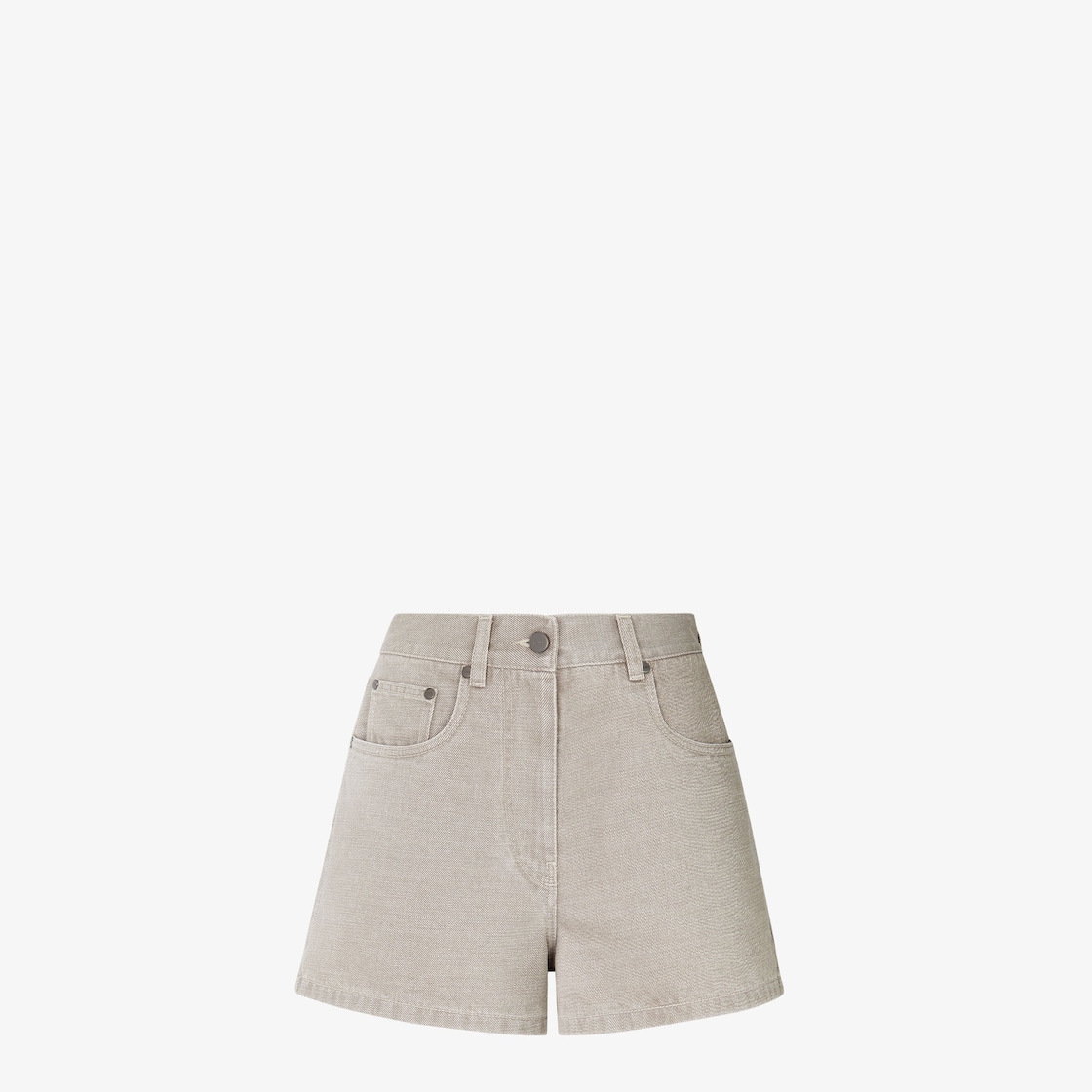 Short cinq poches à la coupe évasée. Passants de ceinture à la taille. Fermeture zippée dissimulée et bouton clou à logo. En denim gris clair. Finition avec logo Fendi Stamp 1925 sur la poche arrière droite. Surpiqûres ton sur ton et rivets en métal.