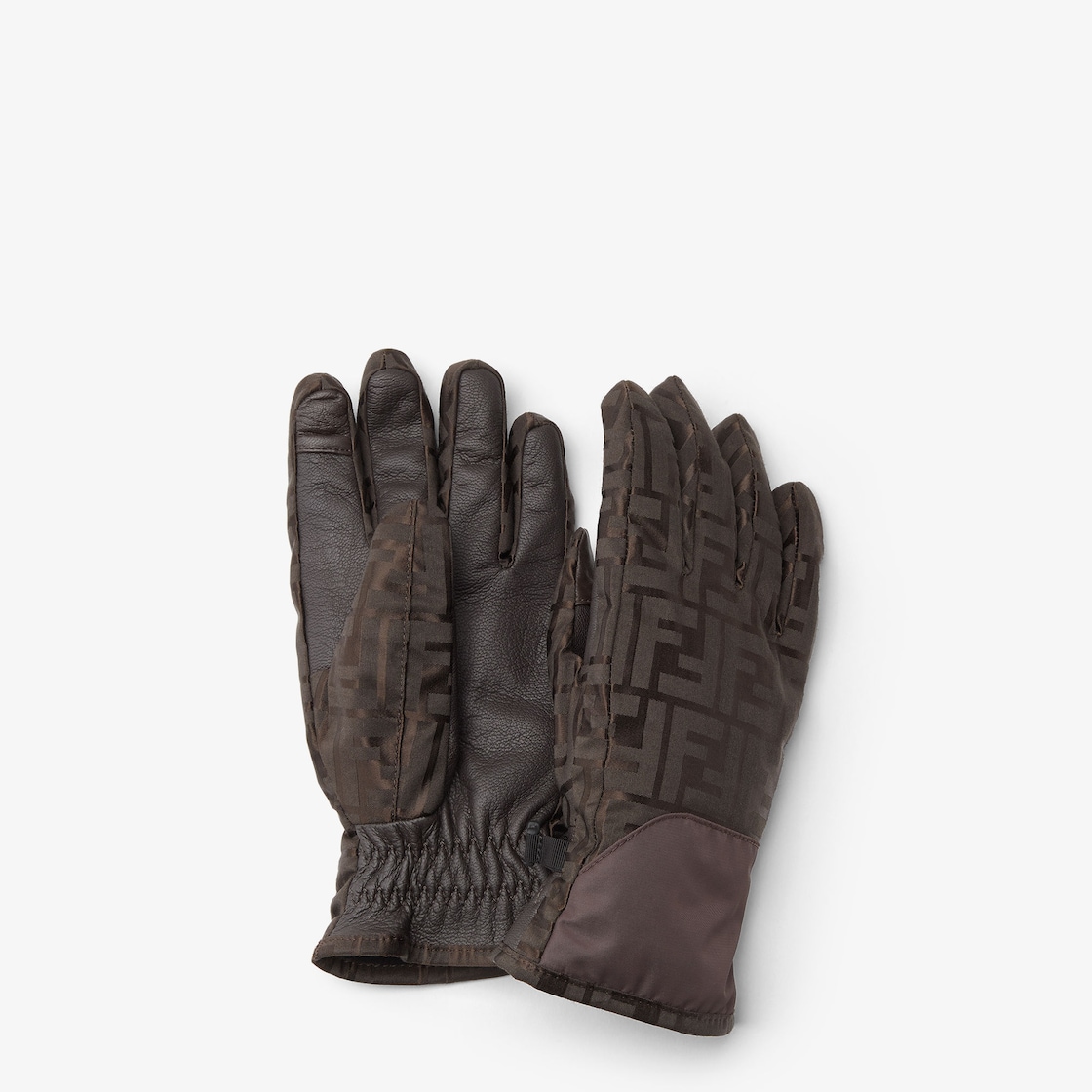 Gants de ski avec cordon de serrage réglable au poignet. En nylon brillant jacquard avec motif FF emblématique marron foncé. Ornés de l’écusson en cuir Fendi Roma sur le poignet gauche.