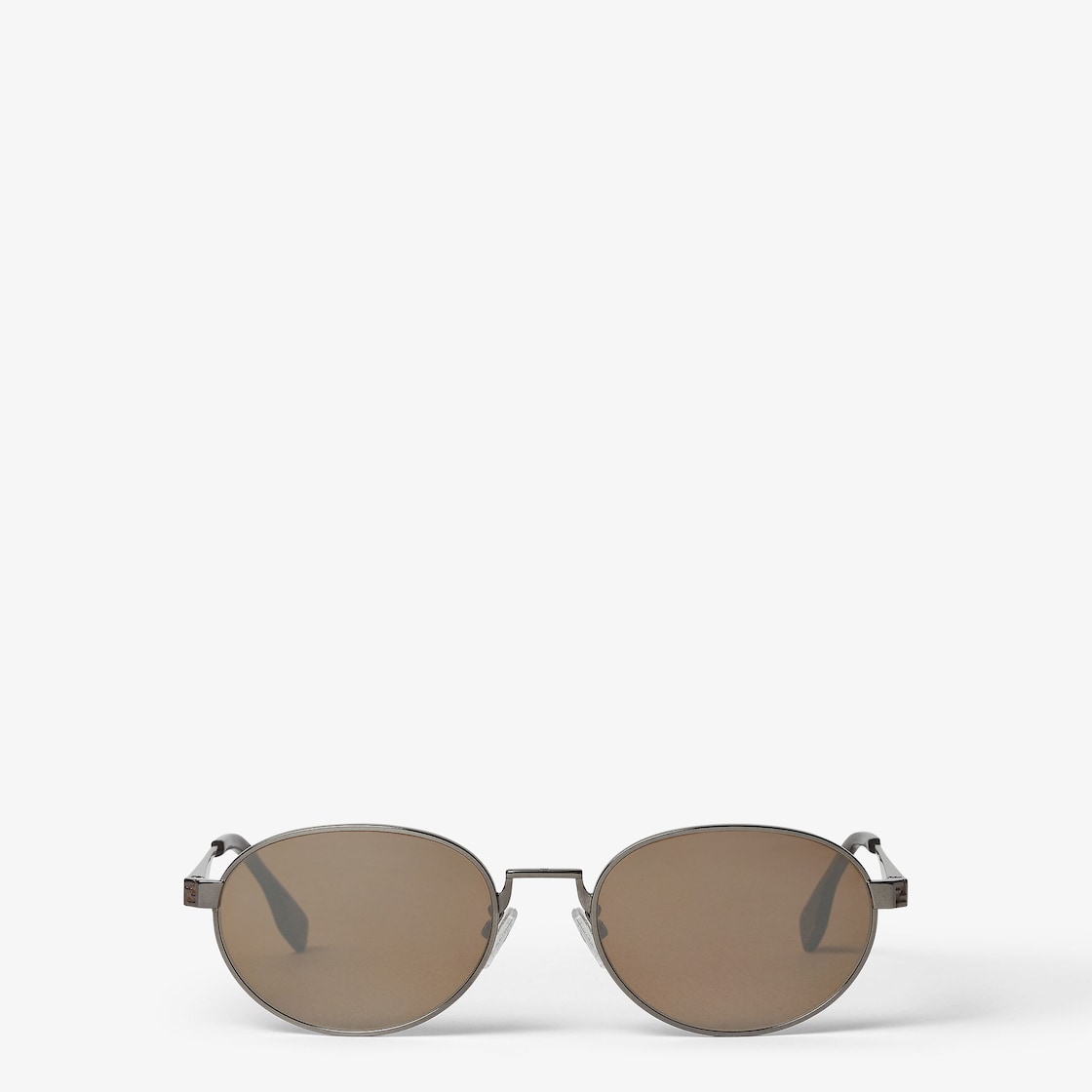 Lunettes de soleil ovales en métal finition ruthénium. Logo FF avec finition émaillée marron. Embouts en acétate avec motif FF. Verres marron avec effet flash argent. Plaquettes réglables.