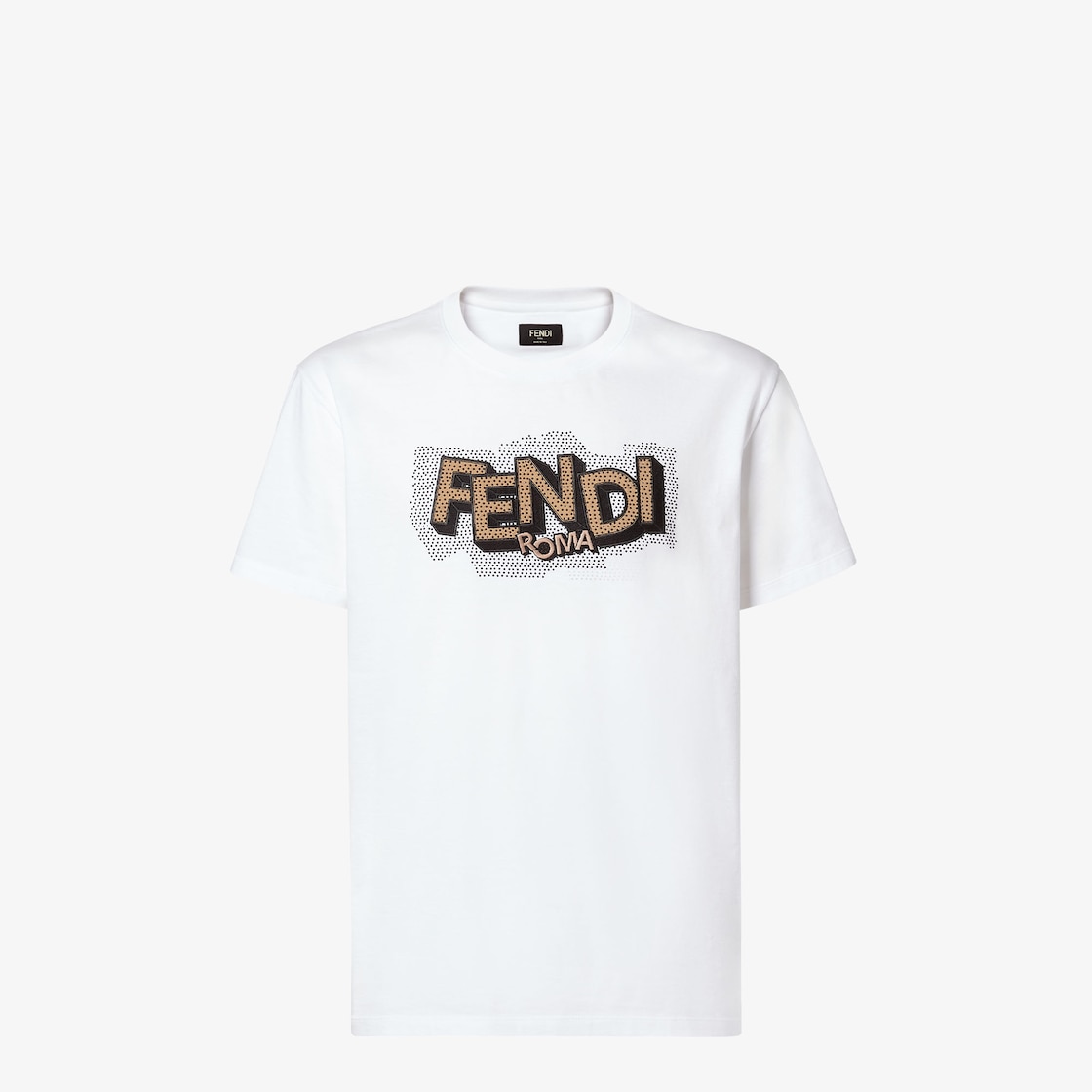 T-shirt coupe slim avec col rond et manches courtes. En 100 % coton blanc. Rehaussé du motif Fendi Pop Pois brodé sur le devant, inspiré du motif Falena Dots de la collection.