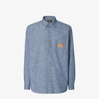 Chemise à coupe confortable avec manches longues et petit col boutonné. Poche poitrine plaquée. Fermeture boutonnée apparente. En chambray de coton bleu clair, avec surpiqûres contrastées. Écusson Fendi en cuir marron appliqué sur la poche poitrine et motif jacron surpiqué à l’arrière du col.