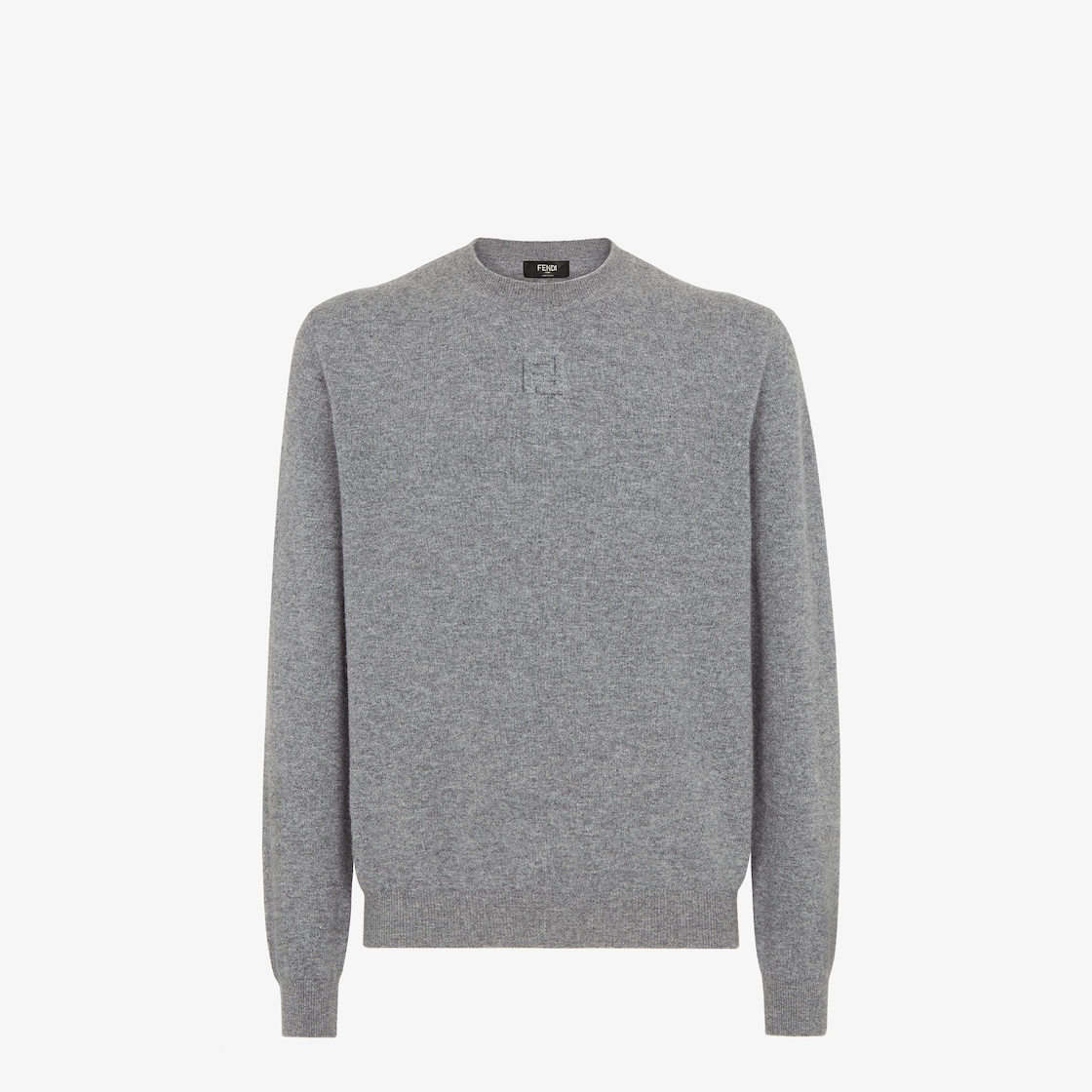 Pull à col rond et coupe classique. En fil de laine gris. Orné du logo FF en relief sur le devant. Finition à bords côtelés.