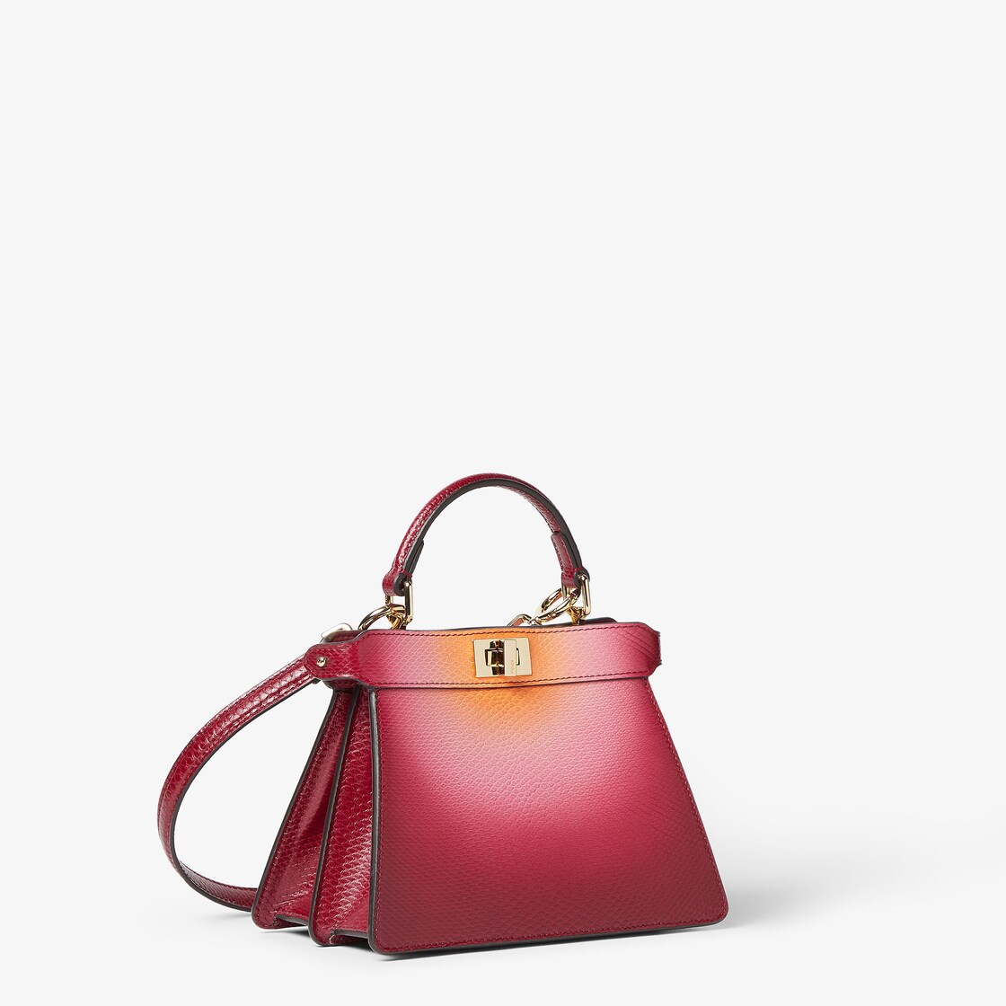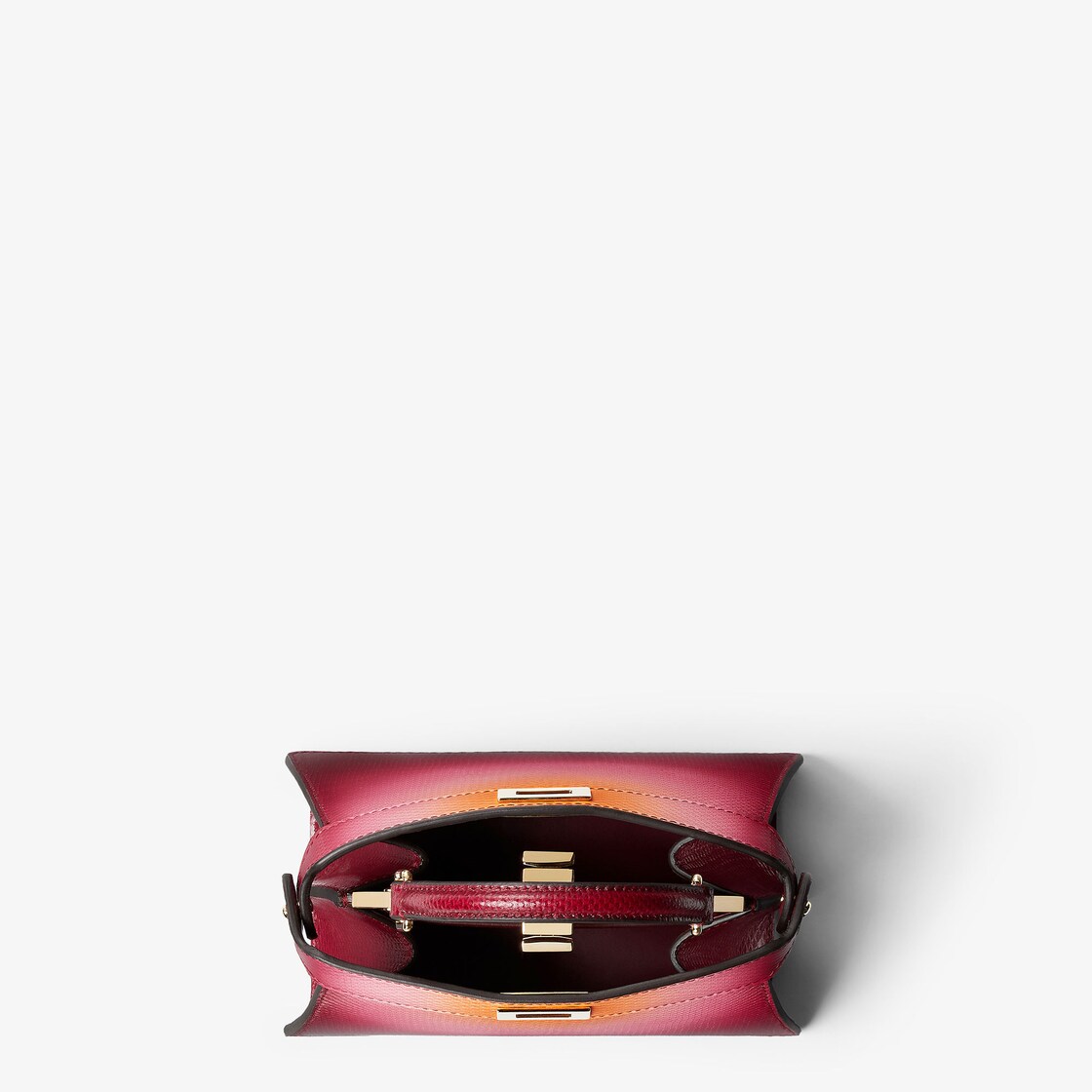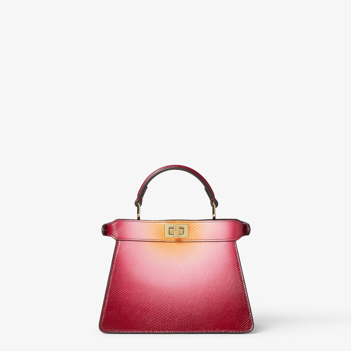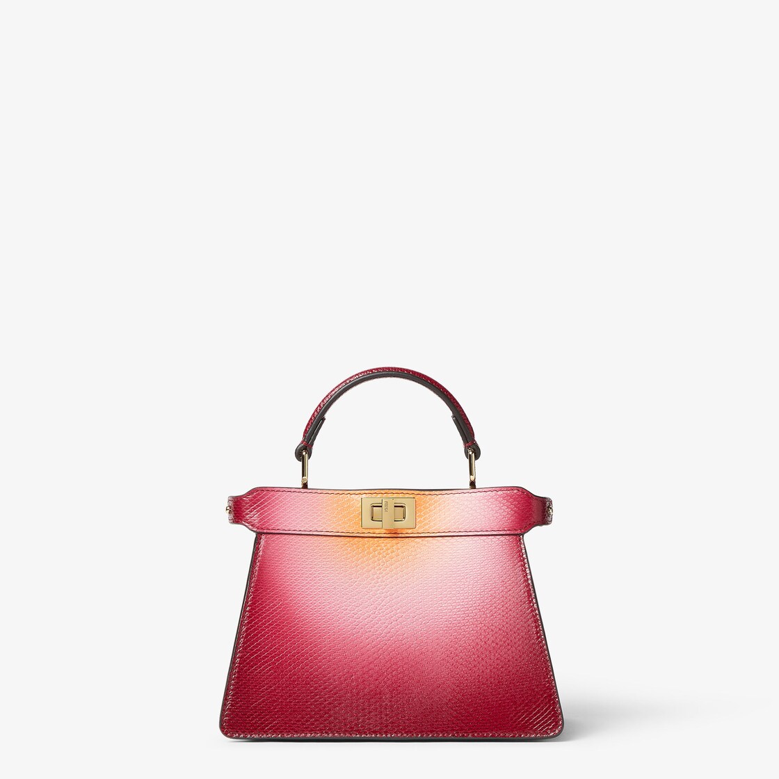 En superbe cuir de karung avec une finition à l’aérographe réalisée à la main pour créer un camaïeu de tons entre cerise et abricot rappelant les nuances des couchers de soleil vénitiens. Le processus entièrement artisanal crée un effet dégradé unique.