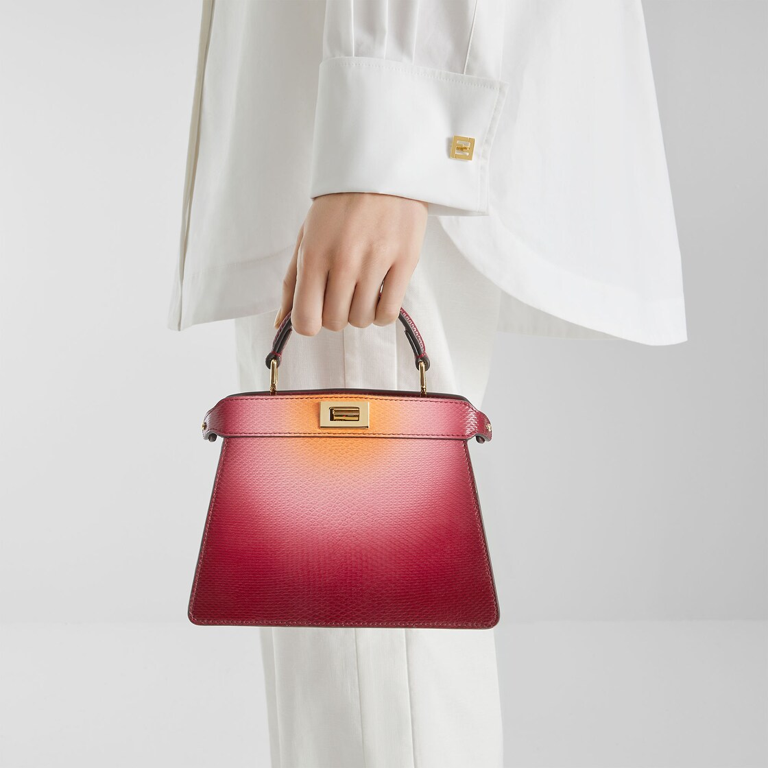 Sac iconique Peekaboo ISeeU, petit format, quintessence du savoir-faire et de la créativité de Fendi. Icône intemporelle, le sac Peekaboo a été créé en 2009. À l’instar du jeu enfantin de cache-cache dont il prend le nom, peek-a-boo, le sac joue sur l’alternance entre beauté extérieure apparente et beauté intérieure cachée.