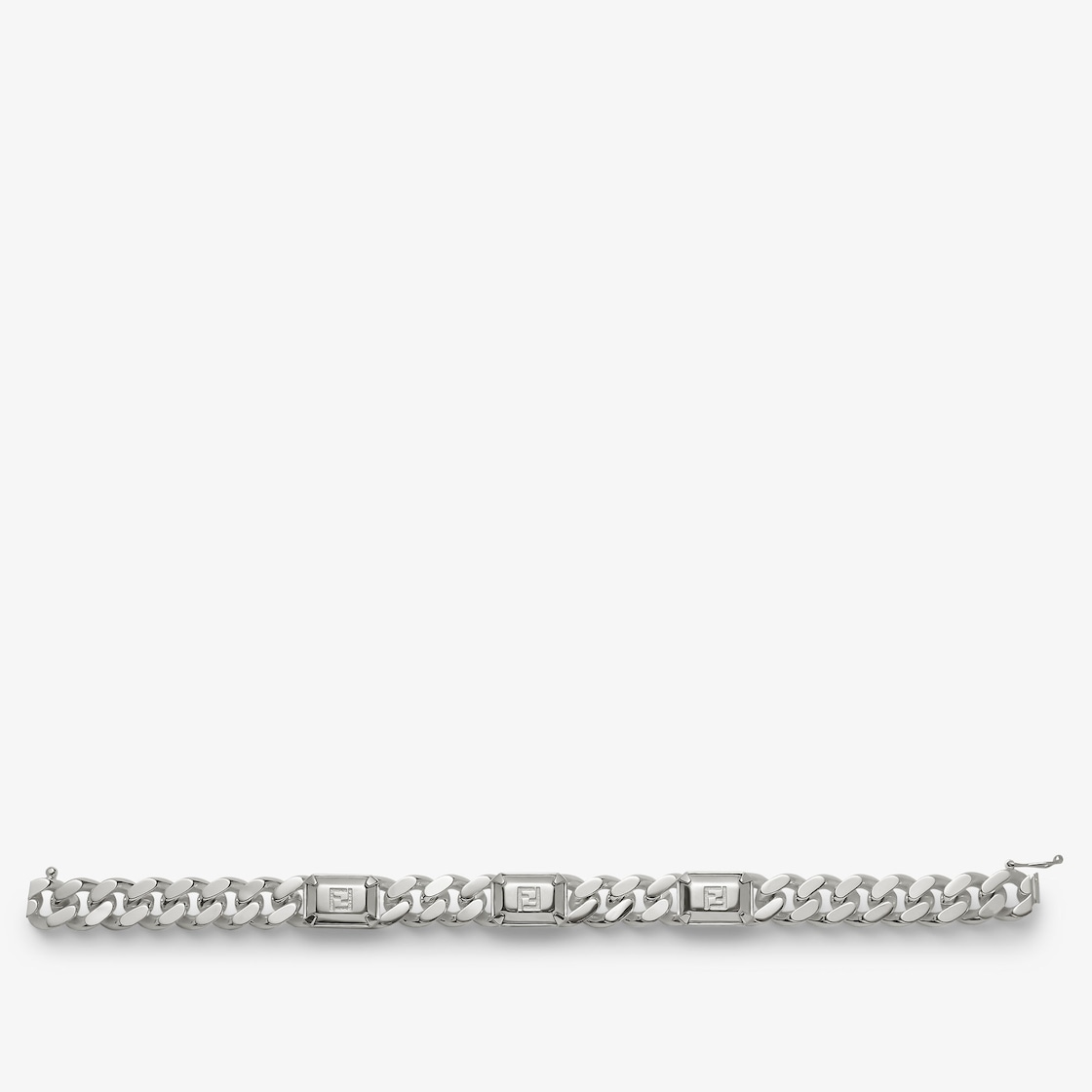 Bracelet with chain link, made of sterling 925 for an extraordinary style statement. Part of the new Fendi 925 men’s fashion jewellery line, inspired by the shapes of precious stones. The bracelet features distinctive and exclusive rectangular-shaped details with engraved FF motif. Box clasp with safety fastening.
