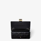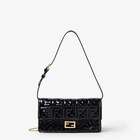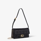 Compact Baguette wallet with flap and FF clasp. Interior compartment with six card slots. Double shoulder strap, one adjustable in leather, the other detachable in fine chain: to carry the bag like a clutch, under the arm or wear it cross-body. Made of soft, black patent calfskin embossed with the iconic FF motif for a three-dimensional effect. Gold-finish metalware.