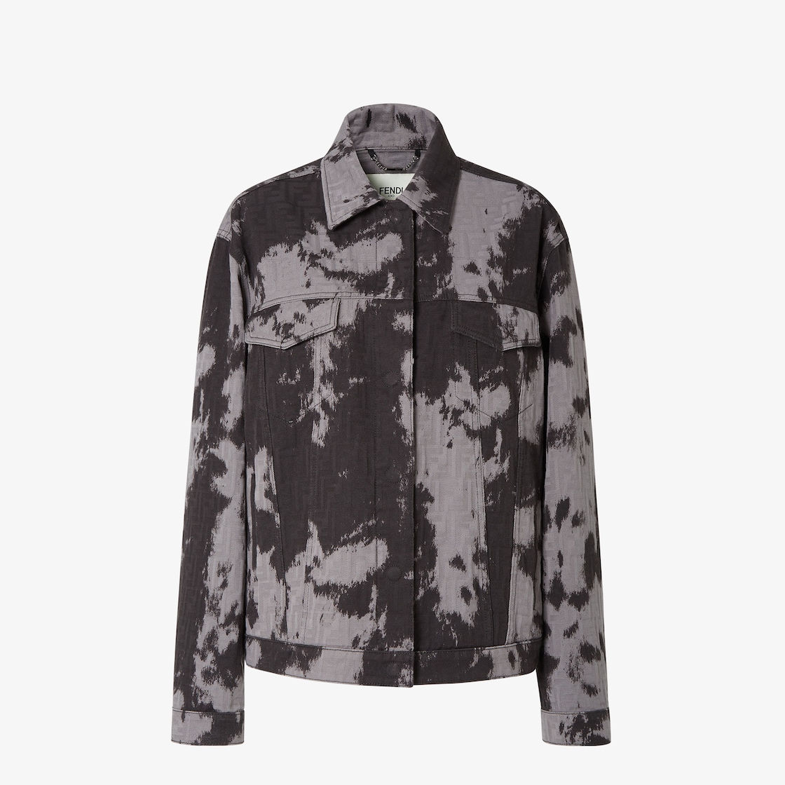 Oversized jacket with shirt collar and long sleeves with dropped shoulders. Flap pockets with button on the chest and side welt pockets. Press stud fastening. Made of jacquard denim with the iconic FF motif and an all-over Frosted Fauna print: a nuanced reinterpretation of the timeless animalier in black and grey, inspired by an archive coat by Silvia Venturini Fendi. Finished with a Fendi Roma leather label applied to the waist on the back.